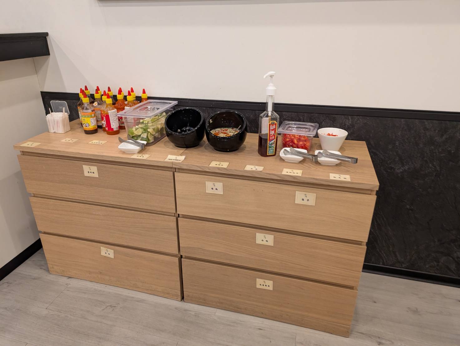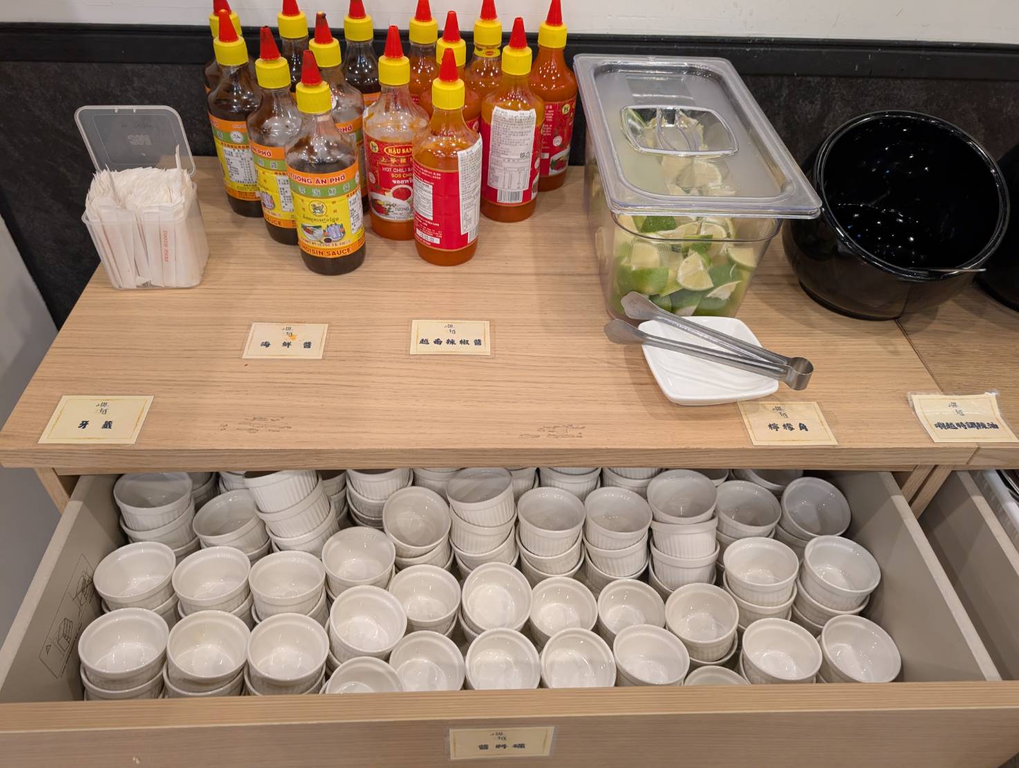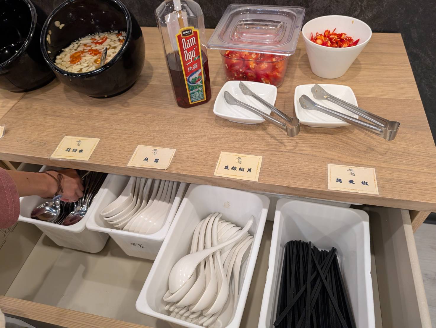 櫃檯旁邊是醬料與餐具區,自助取用。