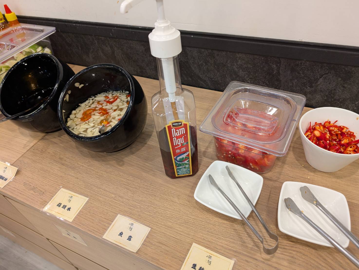 越南料理最精華的便是醬料部分,嶼越直接把越南常用的醬汁一瓶一瓶擺出來,不怕你用。