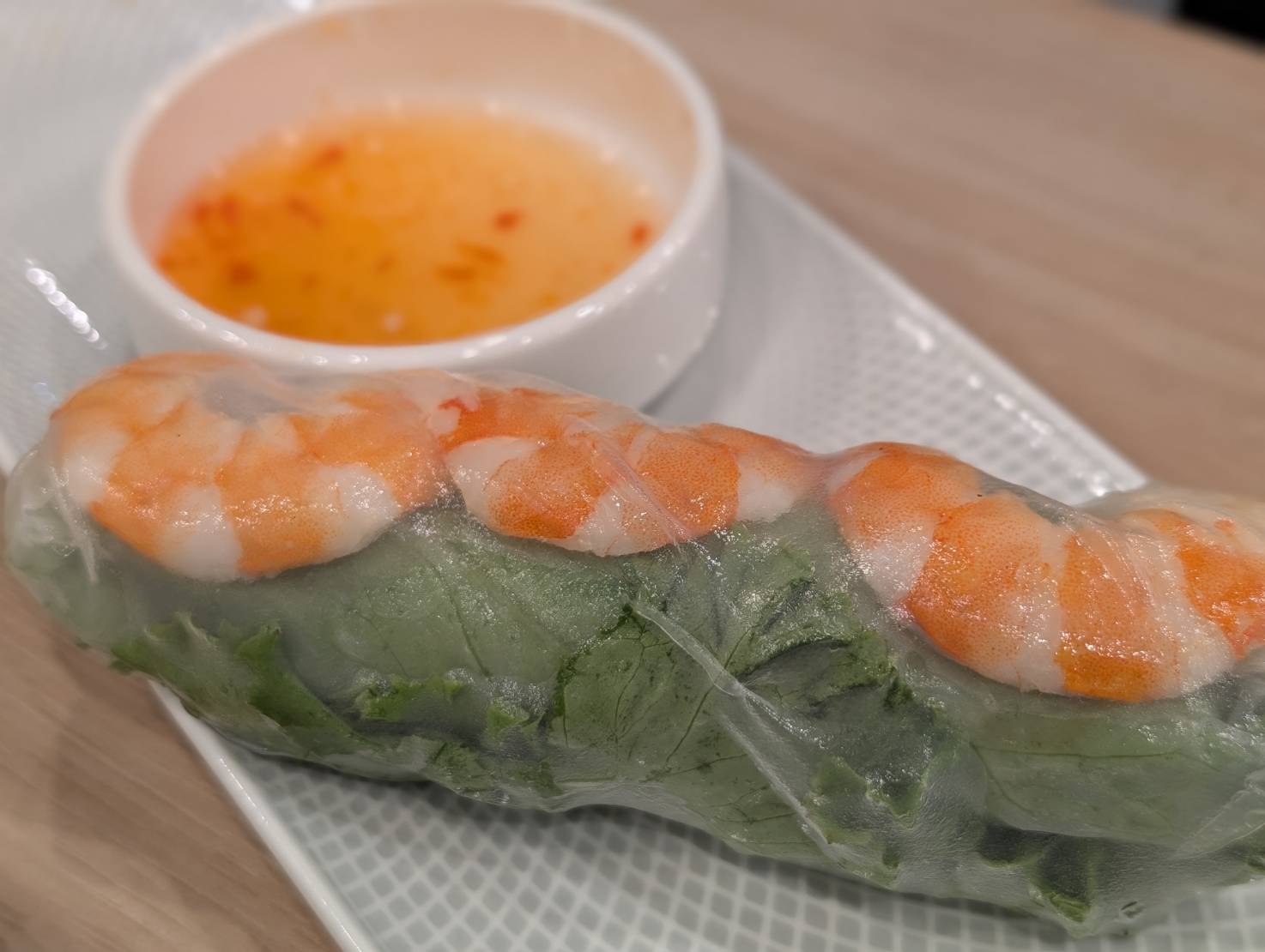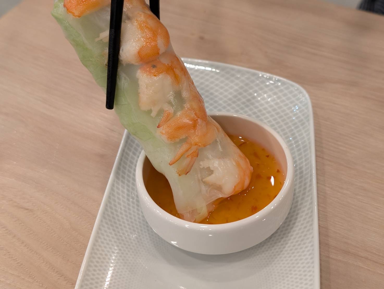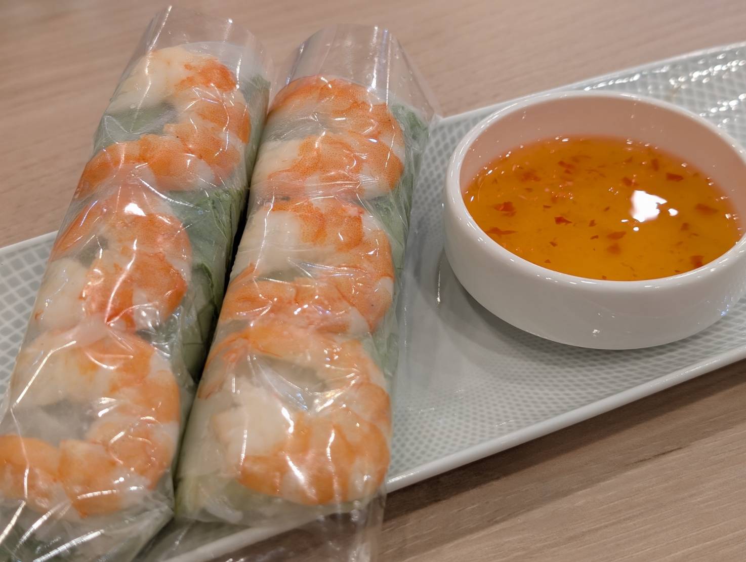 外皮清爽不厚重,裡頭包著新鮮蝦子與爽脆蔬菜,