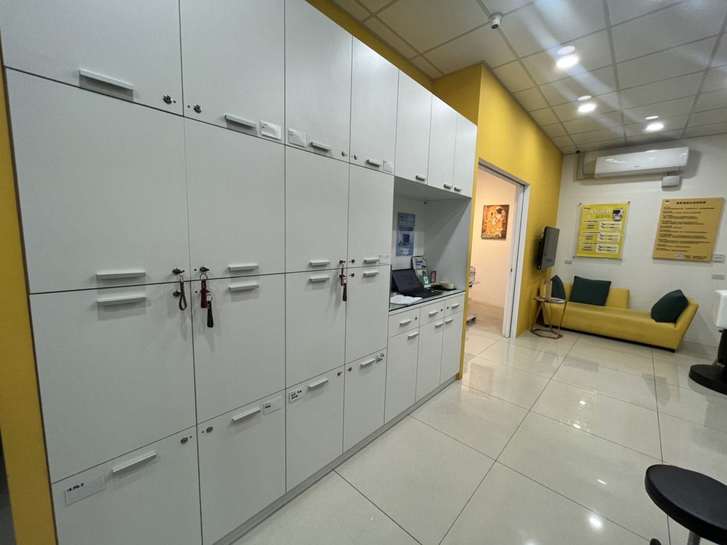 旁邊整排可以上鎖的置物櫃,讓來護膚的客人安心擺放包包。