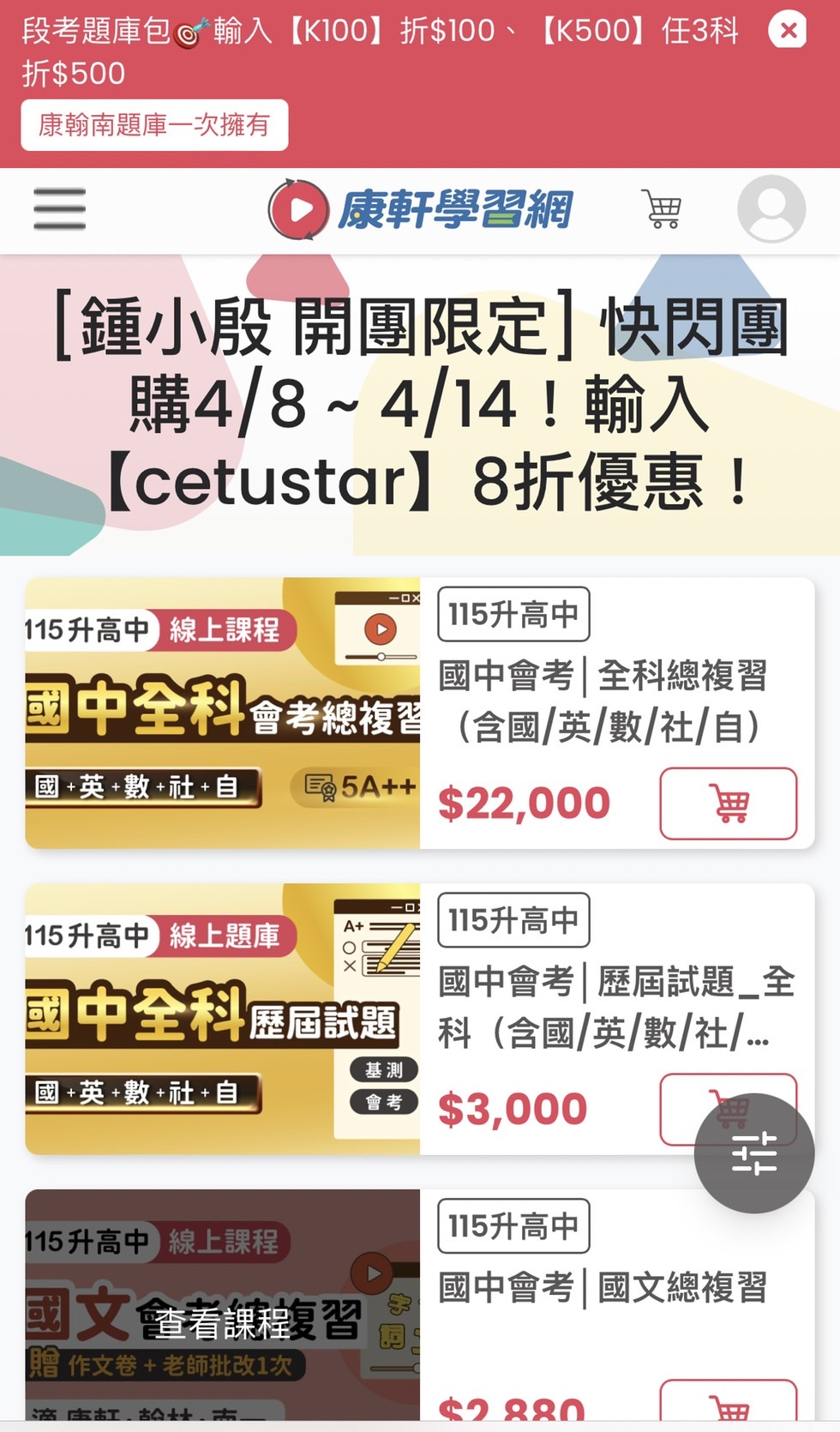 快閃團【康軒學習網】-會考衝刺、課本進度、素養主題、國中先修,輸入折扣碼,全館課程 8 折 !