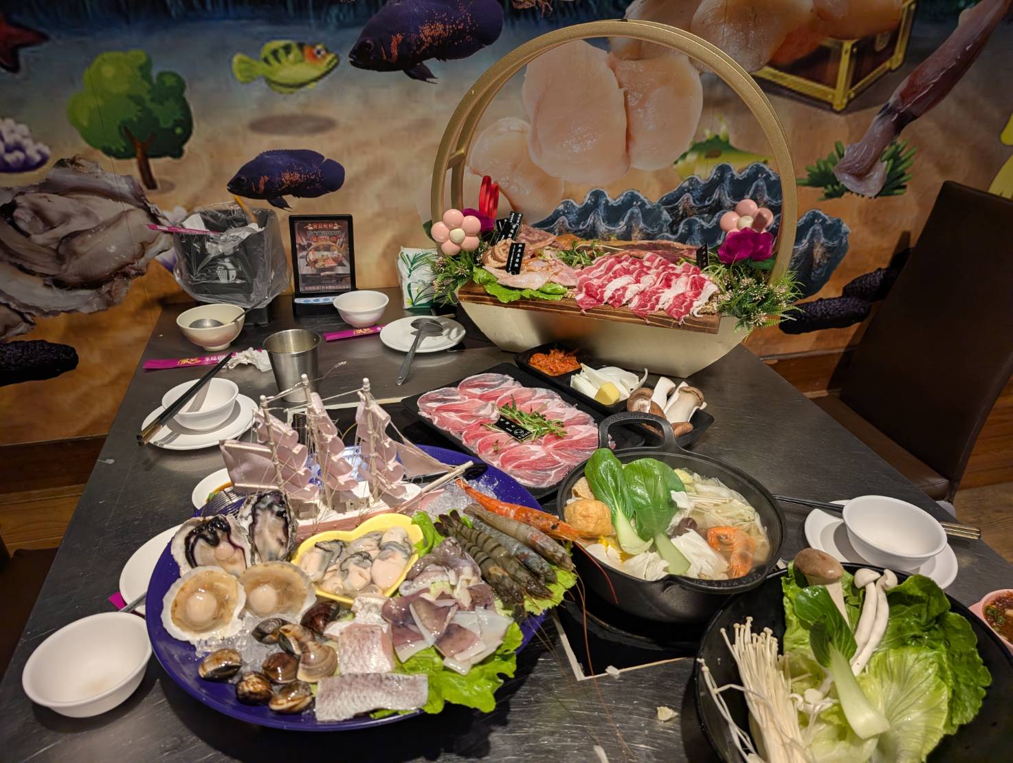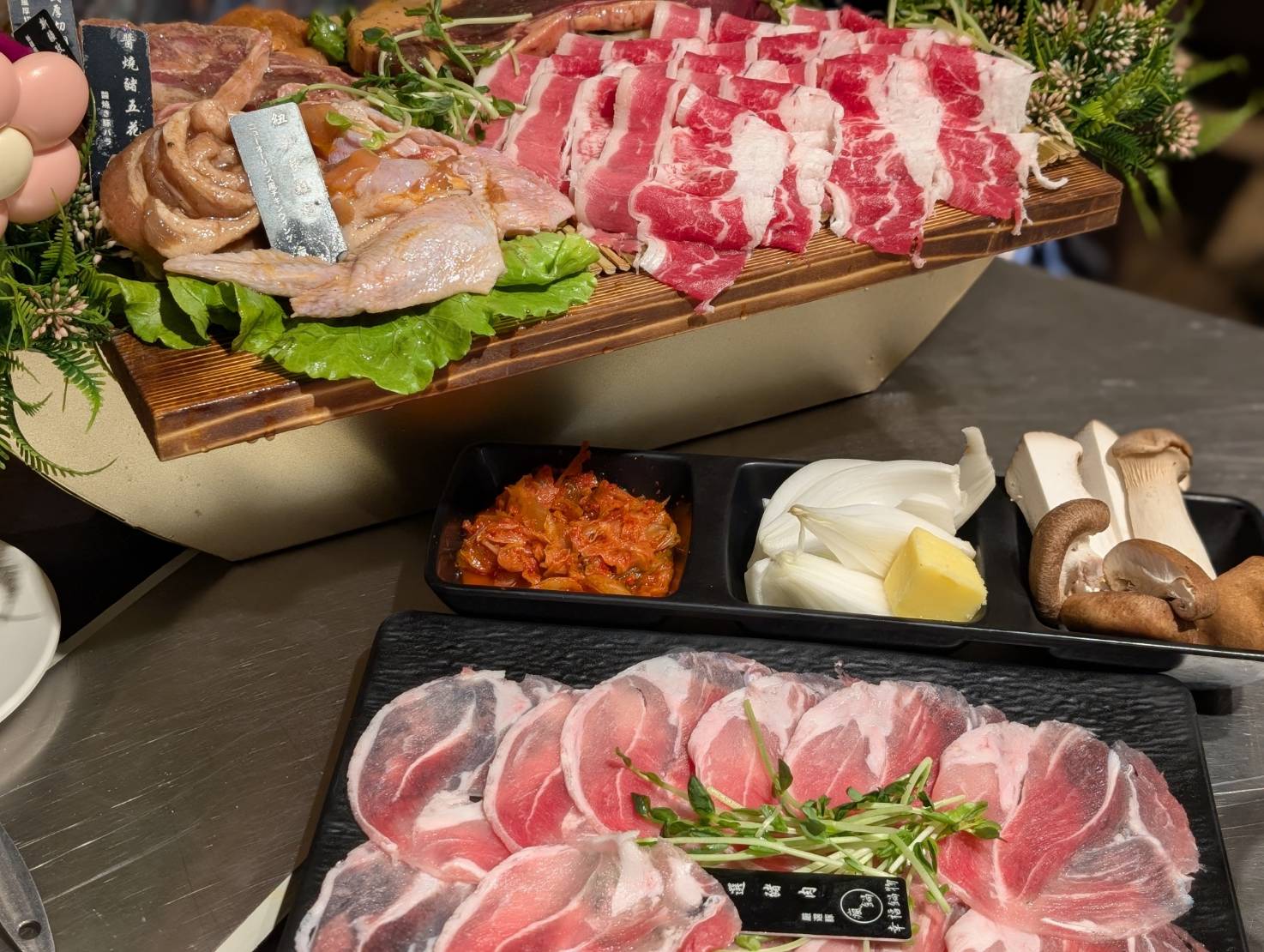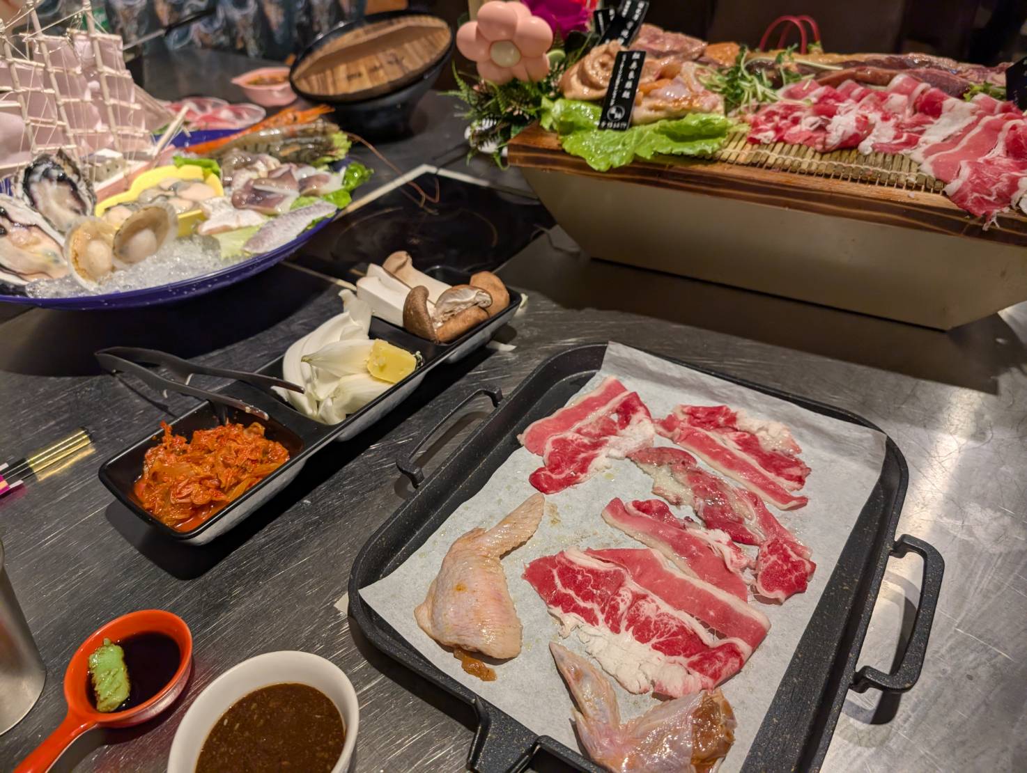 看看這個浮誇的海鮮與肉盤,同時吃到火鍋與烤肉,