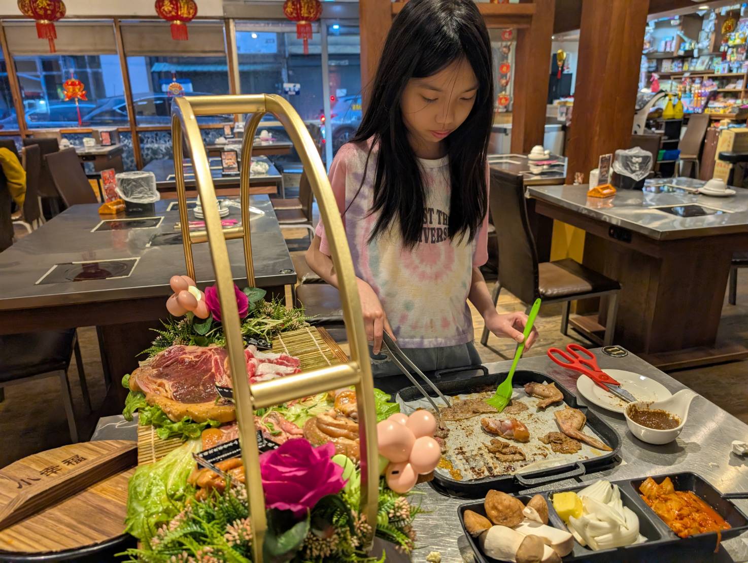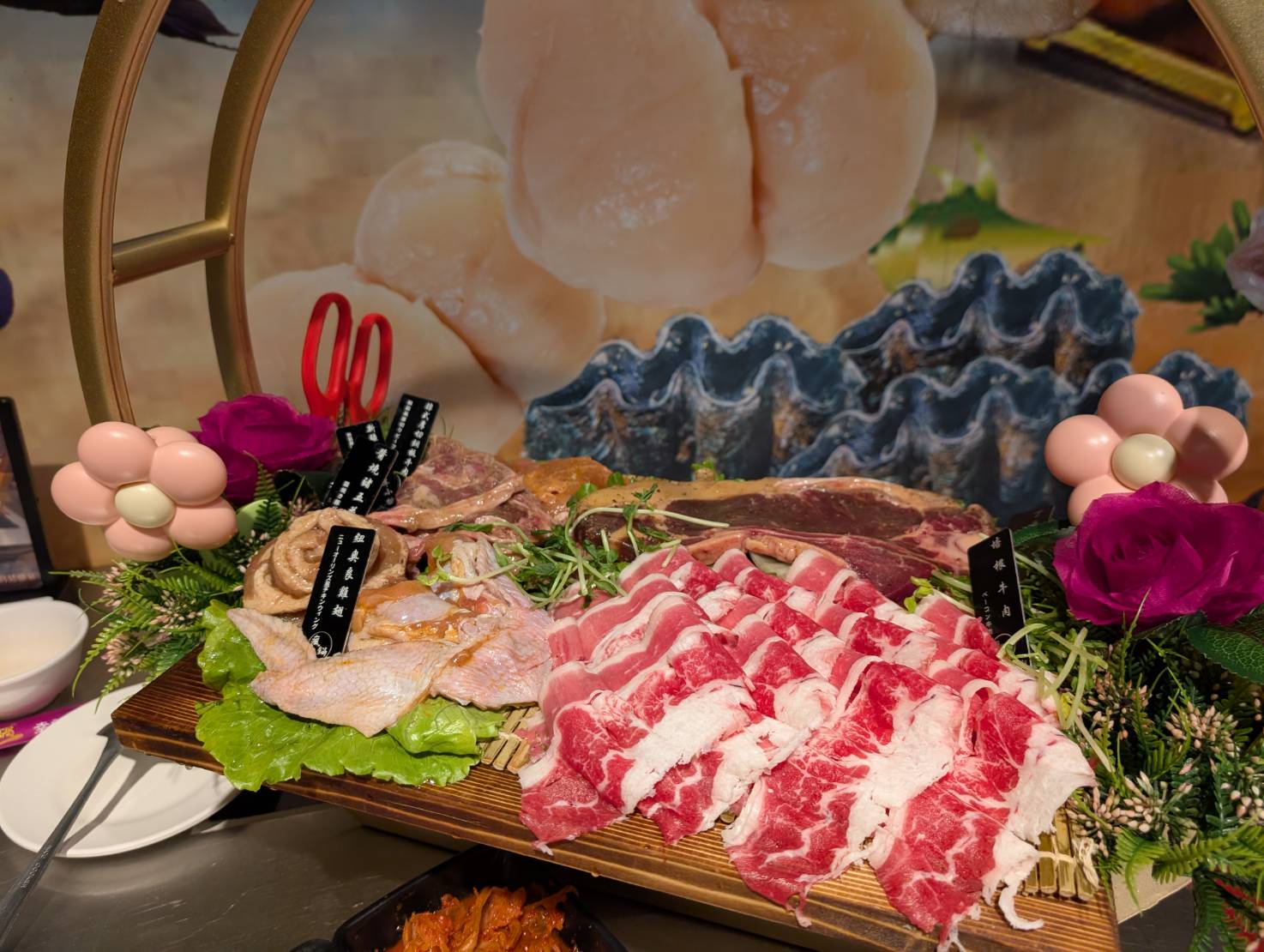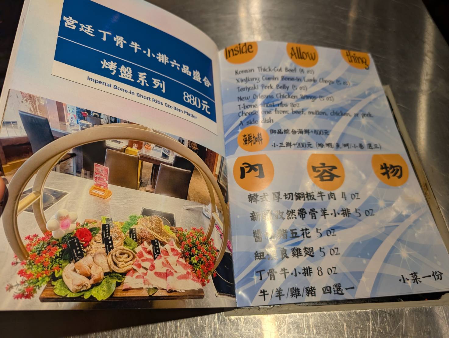 看看這個浮誇的海鮮與肉盤,同時吃到火鍋與烤肉,