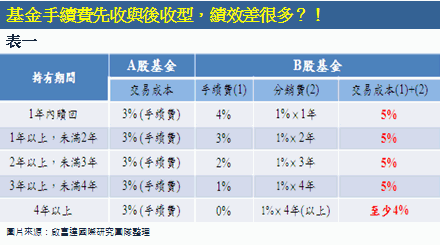 坊間的基金因手續費收費方式不同,即使相同投資組合的基金,因類別不同,績效也不同。收費分類,大致可分為A、B、C類 3種,差異在於收費結構,A類是前收手續費基金,B與C類是後收手續費的基金。前收型指的是購買時,先支付一筆手續費。後收型的是買時不收手續費,等到賣出時才收。甚至,鼓勵長期持有,B類基金持有4年以上就可享有零手續費,C類基金持有時間限制較短,持有一年以上就可享有零手續費。乍看之下,投資人可能會覺得B與C類基金較划算,但事實上可能不是如此。雖然B類基金與C類基金不收申購收續費,但卻要給基金銷售機構一筆佣金,稱為「分銷費」,並直接從淨值中扣除。基金或銀行不收手續費,而是換個名稱而已。分銷費大多按年計費,B類基金一年收取1%,C類基金因持有時間限制較短,分銷費更高,一年約收1.25%。長期下來,B類基金的績效會比A類基金差的原因,就是B類基金還要多扣一筆分銷費。從表一的計算可看出,B類基金的交易成本始終都高於A類基金(如表一)。