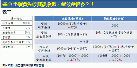 另外,實務上購買基金還需支付「信託管理費」,是基金公司管理基金所需要的費用,一般按照基金凈資產值的一定比例從基金中提取。基金經理人是基金資產的管理者和運用者,對基金資產的保值和增值起著決定性的作用,因此基金管理費收取的比例比其他費用要高,而管理費也會對基金的報酬產生影響,就以一檔前收型及一檔後收型基金為例子來說明(如表二)。由此例可看出,考慮手續費、分銷費及管理費後,基金實際報酬率遠不如預期的10%,且B類基金的報酬率低於A類基金。