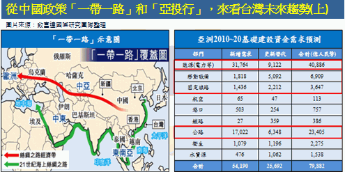 據亞洲開發銀行預測,2010年到2020年,亞太地區約有8兆美元的基礎建設資金需求,尤其是在「一帶一路」戰略的帶領下,其背後意味著巨大的市場和盈利空間。中國藉由「一帶一路」試圖扭轉中國在國際的影響力及擴及力,同時拉動中國的經濟,而台灣經貿與產業在此政策之下,必深受其威脅與衝擊 ,值得我們重視與因應,因為我們的處境就更加嚴峻了。