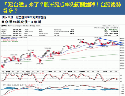 隨大陸證監會官員首度拋出研議「滬台通」,讓台股多頭士氣大震,股王大立光衝關3000元達陣,股后漢微科也漲停站上2000元,激勵高價股衝鋒,也順勢站回9600點大關!隨著近期陸股、港股的互通互惠,造成兩地股市的飆漲,台股有可能也開通「滬台通」?政黨可能引進對岸的資金來買台灣的股票,財政部長張盛和表示,效益還有待評估,但此議題拋出已讓台股產生一些激勵效果,站回月線之上。台股後勢否極泰來了嗎?