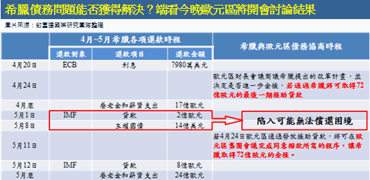 希臘在4月20日支付完積欠歐洲央行(ECB)的7980億美元利息後,在4月底還有17億歐元的養老金及薪資支出需要支付,因此希臘可能在4月底就會用罄現金,這將導致5月份及以後的各項支出可能無法如期償付(如表一)。今天(4月24日)將召開歐元區財長會議討論希臘的改革方案討論是否進一部金援希臘,若通過則希臘可在5月11日取得72億歐元的金援。但麻煩的是,在5月11日前仍有2億歐元的IMF貸款及14億歐元的主權國債需要支付,所以即使希臘承諾以改革換取72億的金援,但也趕不上5月1日和5月8日的債務期限而可能違約,因此最有可能的發生的兩種情況是:一、債權人回心轉意,允許一個寬限期給希臘爭取72億歐元的金援;二、拖欠17億歐元的養老金和薪資,以償還IMF貸款和國債為優先。依照目前的情勢,由於IMF及債務人已發出警告不願意展延希臘的欠款,所以第一種狀況發生的機會並不高,第二種狀況較有可能發生。