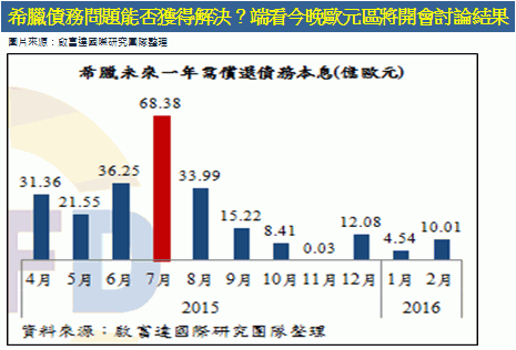 但至此問題仍尚未結束,因為即使度過了這次的債務危機,但希臘未來幾個月的償債壓力仍然相當大,尤其7月還有68.38億歐元債務需償還(如圖一)。今晚將會是重要的關鍵時刻,希臘能不能拿到72億歐元的紓困金,就看今晚的歐元區財長會議的討論結果,若通過讓希臘拿到紓困金,則希臘債務問題可以暫緩,市場可暫時喘口氣,但若沒通過,希臘可能在5月或6月就違約破產,最嚴重的狀況就是退出歐元區了,這對於所有投資人來說,都是個不得不關注的焦點。