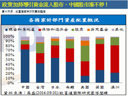 過去幾年中國股市因長期處於熊市,中國的投資者因而將大量資金留置在房地產上或存放在銀行,據高盛統計,2010年中國家庭將72%的總資產配置在現金和房地產上(如圖)。而中國現在會有如此強大的資金動能,主要是因為隨著房地產的疲弱讓房地產的投資回報率下降,再加上近期股市的火爆表現,加大了投資者對股市的資產配置。中國家庭的資產配置在股票比例僅7%,與開發中國家的平均20%相比仍有很大差距,這也表示未來將有更多資金從房地產流出投入股市,中國股市還有上漲空間。