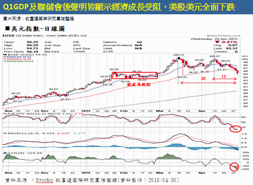 雖本次利率會議,美聯儲表示經濟表現確實不佳,但從FOMC 3月會議會後聲明訊息顯示,在冬季月份,經濟成長有所減緩,係「反應暫時性因素」,央行持續預期經濟將以溫和的速度擴張。也由於經濟成長減緩,Fed官員幾乎已排除了在本次會議中,升息的可能性,大多市場分析師對初次升息的預期,由6月延後到9月。另外,Q1GDP的表現不佳,本在預料中的事,因受天候惡劣的影響,但投資必須看的是未來的預期,目前市場普遍認為第二季經濟成長(GDP)可望回溫,且認為下週(5/8)即將公佈4月份就業報告時,或將開始「意外改善」。
