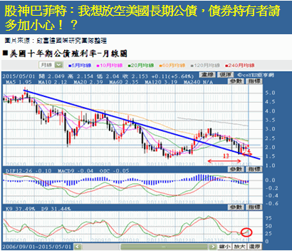 近期從十年期公債殖利率的技術面來看,月線圖顯示突破下降趨勢軌道回撤達13個月,正好臨軌道支撐往上揚升,月KD值低檔黃金交叉,呈現長多格局。週線圖則呈現中多格局,日線圖形成上升三角型,都是呈現未來十年期殖利率要走上揚的態勢,這也難怪股神巴菲特想要放空美國公債。因此,債券持有人不要因為了固定利息收益,而在債券價格蒙受一大損失,最後總報酬反而是虧損的,也千萬不要與股神對作喔!