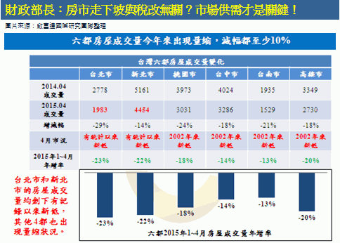 就房地產供需來看,全台房市出現供給過多的現象,根據主計總處資料,截至2015年3月全台建物存量高達917.82萬棟,若依照全台平均每年成交38.35萬棟計算,則相當於必須耗費23.93年才能全部消化完畢,這還是在過去有人口紅利情況下的年限,若未來將面臨日益惡化的人口老化與少子化,銷耗的年限就要更長了,顯示台灣房屋供給過剩問題嚴重。根據內政部不動產資訊平台的數據,六都房屋成交量今年出現減幅都至少10%,雙北市更大幅下滑20%以上。就2015年Q1全台房屋成交件數僅有6.4萬棟,與去年同期相比衰退了18.6%,而若假設今年Q2、Q3和Q4均同樣以18.6%的速度衰退,則2015年全年全台的房屋成交量可能僅有26.1萬棟(圖一),倘若衰退幅度比預估的還大,則甚至可能會跌破史上最低點在2001年的25.9萬棟成交量水準,成為有統計以來的最低。六都中今年4月台北市和新北市的房屋成交量雙雙創下有統計記錄以來新低,其他4都也出現2002年來新低(圖二),台灣的房屋需求已出現明顯的降溫了。