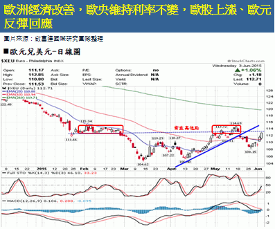歐洲央行(ECB)周三(6/3)決議維持基準利率不變,行長德拉吉表達對歐元區經濟復甦看法正面,沒有必要擴大QE, 但強調不考慮提早結束QE,歐洲三大股市上漲,歐元反彈回應。