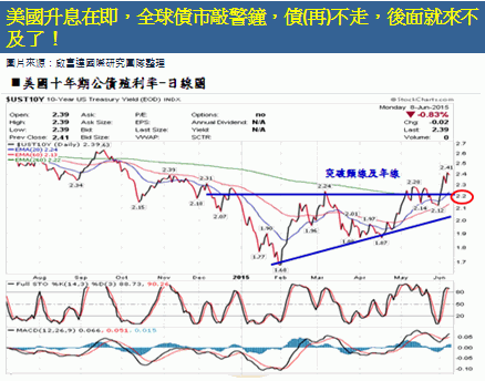 就來技術面來看,短中長期的月線、週線、日線都呈多方格局,甚至,在日線圖上(如圖),突破上升三角型的頸線(2.2%及年線的壓力,來到2.4%左右。近期,聯儲副主席費舍表示預計如果經濟如預期般的改善,3-4年後聯儲利率可能介於3.25-4%。若以美國現在聯邦利率是0-0.25%,倘若3-4年後美國利率升到3.25-4%,以此類推,美國十年期公債殖利率未來可上看6%,屆時債券會崩盤的。