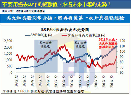 最近市場上,很多投信投顧業者紛紛「提及美國即將升息,可參考上次(2004年6月)升息的經驗來看各個市場與投資工具的表現。對此,啟富達研究團隊有不同的見解,就美國升息經驗值來看,不可參考上次(2004年)那次的經驗值,因為現在所處的金融環境與上上次(1994年2月)較為雷同,當時與現在一樣,美元與美股是同步走揚,不同於2004年時美元與美股是負相關,邏輯不同,思維就要不同。