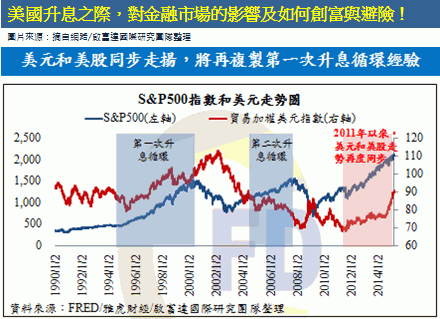 自1990年至今的20多年來,美國先後曾在1994年2月和2004年6月啓動兩次升息循環。在1990-2000年間,美國受惠電腦產業的創新,科技網路的普及,因而吸引大批資金湧入美國、投資電腦科技產業,帶動了美國經濟繁榮復甦,美股的強勢,進而推升美元的升值,因此締造出美元與美股同步走揚。但美元的走升,勢必引起市場上的資金撤離原本投資在新興市場的部位,形成匯率的貶值,造成當地通貨膨脹的上升、央行以升息來抑制通膨、造成發債成本墊高,進而引發金融風暴,如1995年的墨西哥危機、1997年的亞洲金融風暴和1998年俄羅斯危機。從過去歷史經驗來看,美元出現持續升值,勢必引爆新興市場債務危機,在第一次升息期間(1994.02~2000.08),因為美元強勢走升,造成大多數亞洲國家貨幣的貶值及股市的下跌,形成新興市場股、匯市雙雙大跌,此期間歐美等成熟國家股市的漲幅遠優於亞洲開發中國家。所以,在美國第一次升息之際,當時投資環境是美元走強的年代,美元與美股是正相關。