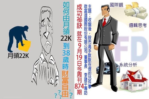 財富來自於觀念與方法。從0到100很辛苦,但是,有了正確的知識及方法,從100到500就很快。9/19(星期四)今周刊 874期 訪問啟富達公司 李建平 董事長,文中內容值得您細讀,發人深省。