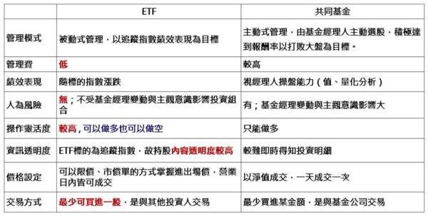 ETF是在證券經紀商開戶交易買賣,且價格會在盤中隨時變動;共同基金則是依每日收盤後結算的基金淨值來交易。另外和共同基金相比最大的差異在於,ETF管理方式屬於「被動式管理」,以追蹤指數績效表現為目標,而共同基金為「主動式管理」,由基金經理人主動選股,積極達到報酬率以打敗大盤為目標。