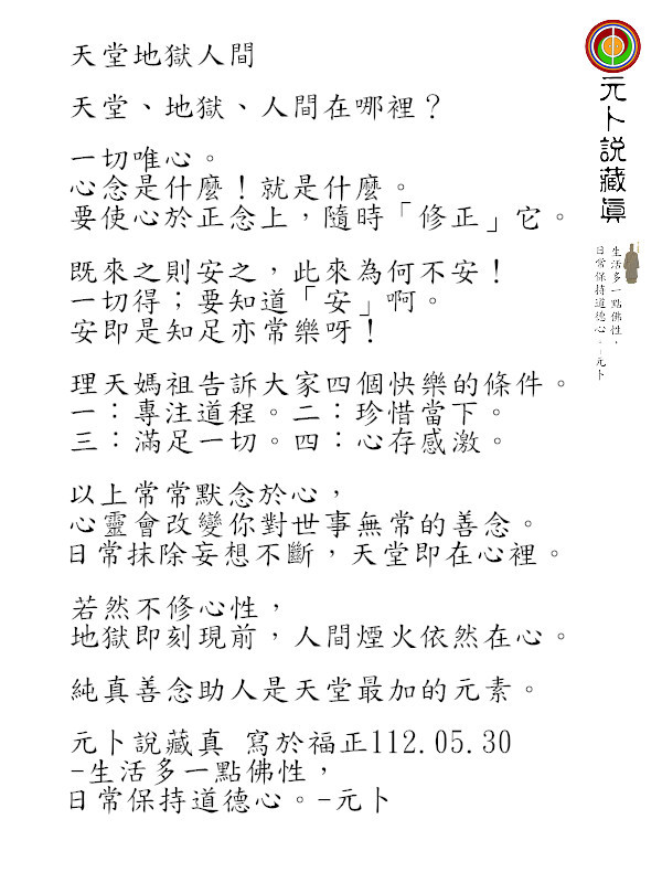 以上常常默念於心,心靈會改變你對世事無常的善念。日常抹除妄想不斷,天堂即在心裡。