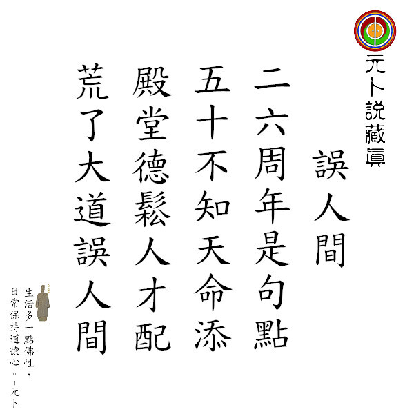 誤人間 二六周年是句點 五十不知天命添 殿堂德鬆人才配 荒了大道誤人間 元卜說藏真 寫於福正114.11.30 -生活多一點佛性,日常保持道德心。-元卜