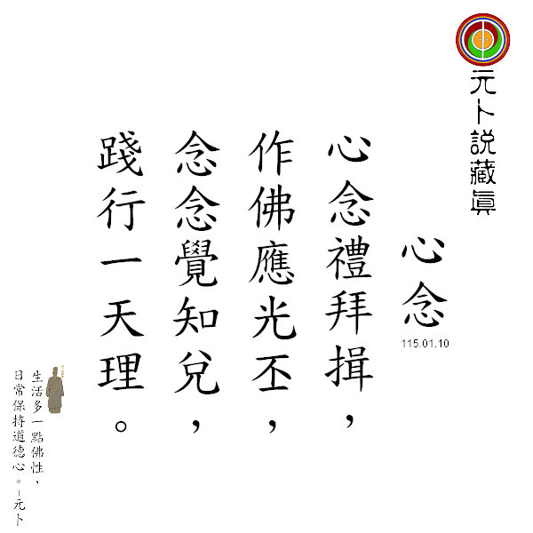 心念 心念禮拜揖,作佛應光丕, 念念覺知兌,踐行一天理。 元卜説藏真寫於115.01.10 -生活多一點佛性,日常保持道德心。-元卜