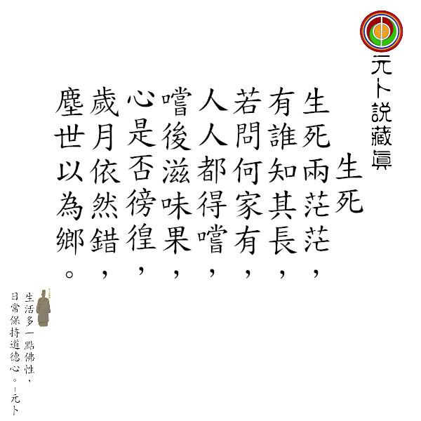 生死 生死兩茫茫, 有誰知其長, 若問何家有, 人人都得嚐, 嚐後滋味果, 心是否徬徨, 歲月依然錯, 塵世以為鄉。 元卜說藏真 寫於福正114.11.29 -生活多一點佛性,日常保持道德心。-元卜
