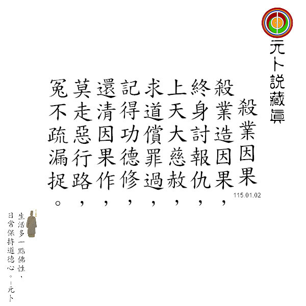 殺業因果 殺業造因果,終身討報仇, 上天大慈赦,求道償罪過, 記得功德修,還清因果作, 莫走惡行路,冤不疏漏捉。 元卜說藏真 寫於福正115.01.02 -生活多一點佛性,日常保持道德心。-元卜