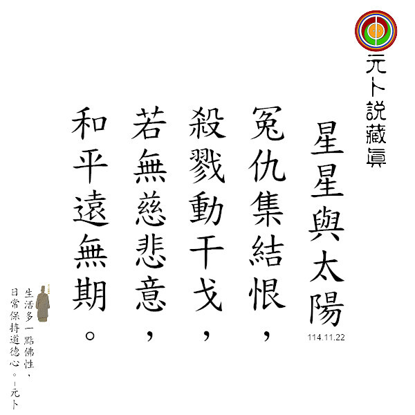 星星與太陽 冤仇集結恨 殺戮動干戈 若無慈悲意 和平遠無期 元卜說藏真 寫於福正114.11.22 -生活多一點佛性,日常保持道德心。-元卜