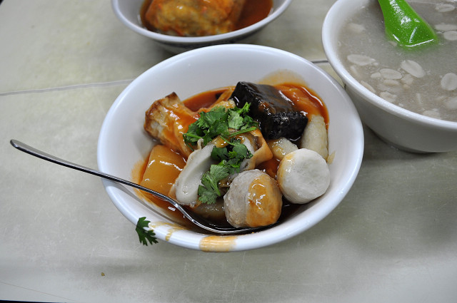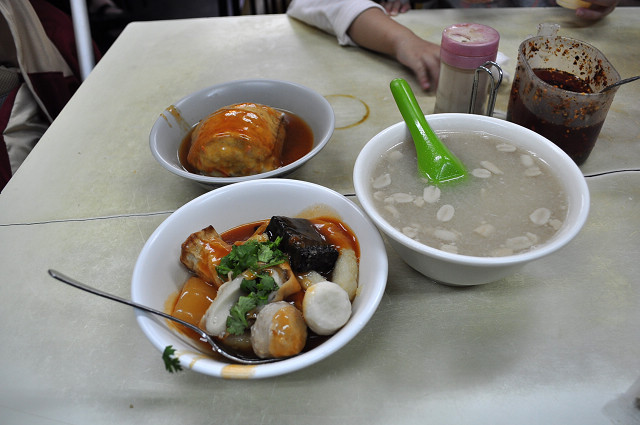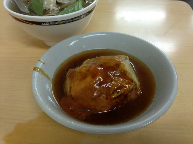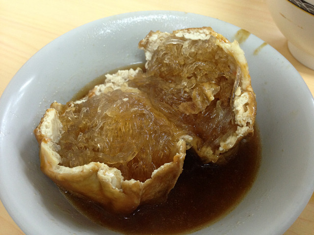 這間店的阿給雖然沒有老店那麼有名,但油豆腐與魚漿做的阿給皮算是厚實,蒸過後不會軟爛,裡面包的冬粉還算Q,淋上略帶點辣的醬料,非常夠味,但對查德與水果姐妹來說太辣了,所以老闆給我們淋一半醬油一半阿給醬,這樣吃起來剛剛好。