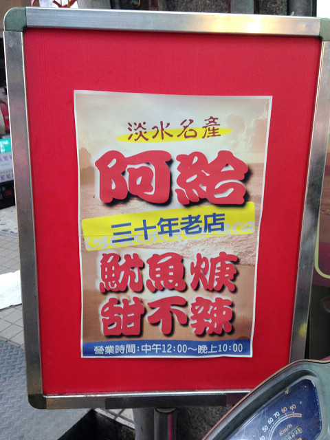 這間店沒有店名屬於無名系的,賣的是阿給、魚丸湯、魷魚羹麵、甜不辣跟豬血糕,來吃的多屬於淡水在地人,偶而會看到一些外國人按圖索驥而來,想必是看旅遊書來的。其實早在查德唸淡江大學時就已經是這間店的老主顧了,因為覺得阿給的味道不錯,麵也好吃,所以常常下山來光顧。