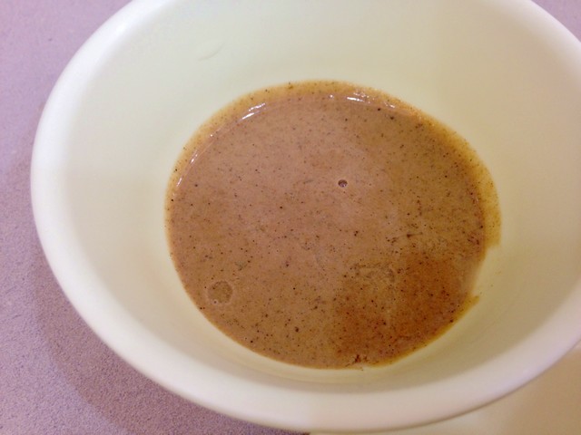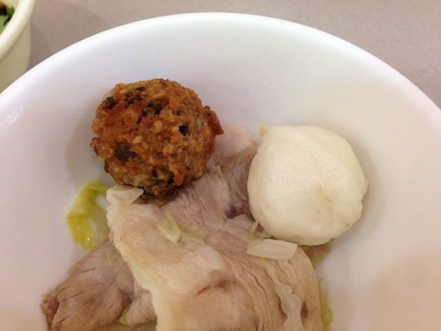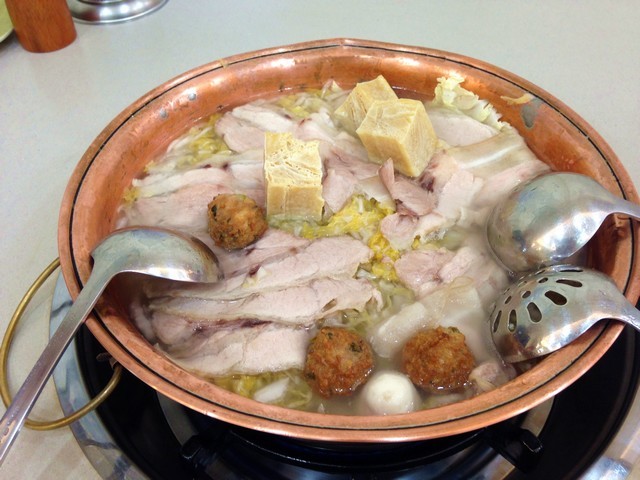 我們三個人吃酸菜白肉鍋....有點拚,所以火鍋料沒點太多,只有點一份白肉、自製肉丸、花枝丸與凍豆腐...這樣應該差不多。這湯頭真的挺酸的,對於愛酸的人來說非常夠味,自己可以調配沾醬,但店裡有種特製的綜合醬,查德覺得味道相當不錯,有點像是麻醬很香濃帶點甜味,火鍋料沾了味道挺不賴的喔!