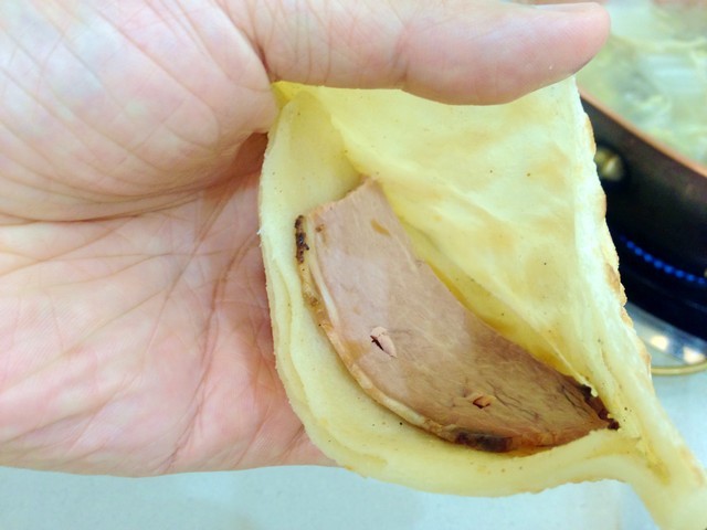 ▲把燻肉放入餅皮中,如果覺得不夠可以放兩塊燻肉。