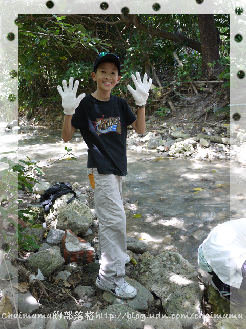 孩子在野外觀察生物的經驗已經相當豐富,整個包包裝滿了他的工具與裝備,由於去年到海邊手指因搬岩塊而受傷,今年連綿布手套都帶齊了呢!!