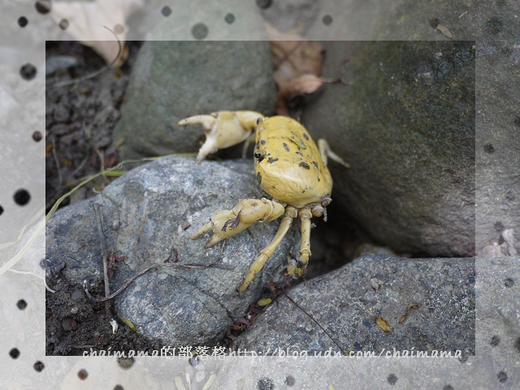 另外,我們也在墾丁的牧場路邊看到陸蟹,整個殼是黃色的,當牠在水裡時相當不容易被發現,因為牠就像一片落葉靜靜的躺在河流裡喔!