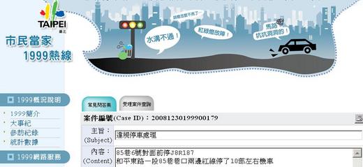 這次我下去等了警察半小時,結果毫無蹤影.回家上網一查案件編號,說是私人土地無法告發.我馬上再撥1999.服務人員非常熱心的告訴我是私人土地無法告發.我回答那有整條巷子都是私人土地的.如果是私人土地何必劃紅線?服務人員又幫我報了案,我這回又下去等警察.