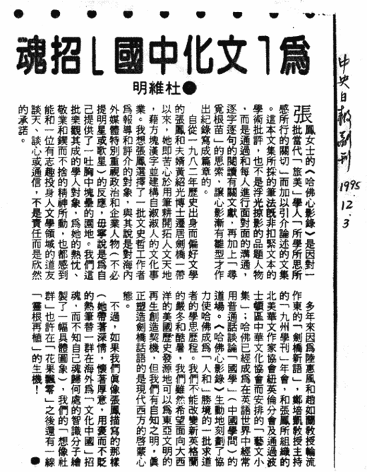 歷史文化傳承是一件很辛苦的事,尤其在功利主義的今天,很少人有人願意投身這份不為名利的工作,張鳳妳能為中華文化盡一份心力,尤其在世界最有名的哈佛寫書,可以將近代中國著名文人的著作和生平事蹟, 介紹給國際友人,也是好事一件呀。。。很值得我們敬佩