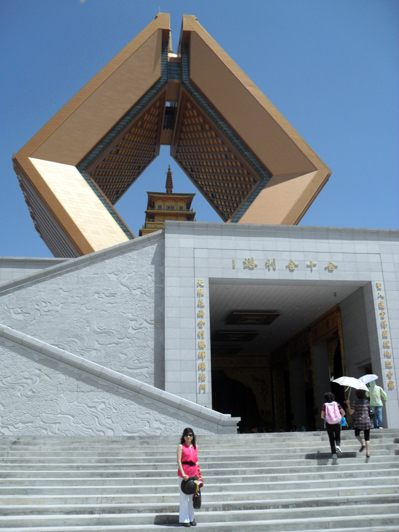 于五十層樓高,中間有安放佛指舍利的唐代造型寶塔建築,合十