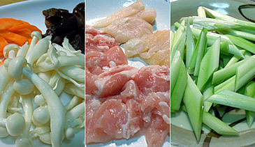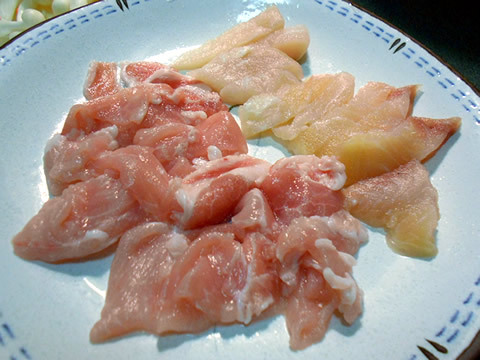 1. 將里肌肉與鯛魚片切成適度大小,用太白粉、鹽與蛋白稍為抓醃一下。