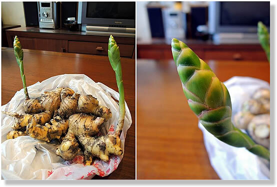 電話那頭,媽媽略帶興奮的告訴我這件〝新鮮事〞,我的確沒看過「薑花」,很是好奇!宅急便收到當天,媽媽還特別打電話來關切:「薑花有沒有被折斷?」我告訴媽媽:「薑花安好,可是怎麼是合起來的,沒有花?」我上網查了資料,確定這只能算是薑的「花苞」,真正的薑花會從鱗狀的苞片開出,不過由於花的壽命短又容易被莖葉所掩蓋,所以看過薑花的人並不多!媽媽自己種薑許多年,也只說:「好像看過」,我原本想,若留著花莖不折斷,有沒有機會等它開花?媽媽說:「恐怕很難,因為這花莖已挺在菜園子裡很久,始終未見它開花呢!」