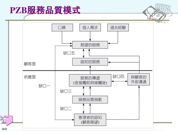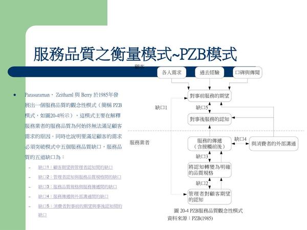 巴羅蘇拉曼、瑞瑟莫和貝利3位教授的品質缺口模式(PZB Quality Gap Model)共有5個缺口,若能建立對應的衡量系統,衡量的結果做為作業系統改善方向和設置改善目標的依據,對企業體質的強化和市場競爭力的提升是有效益。
