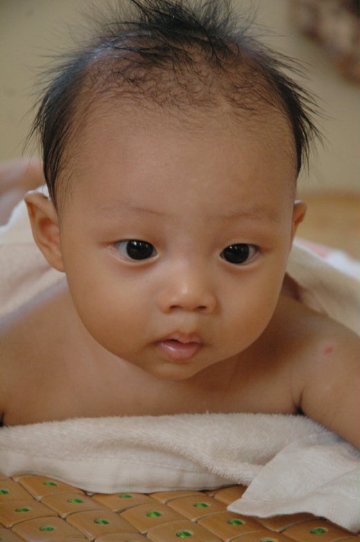 小豬頭髮不濃密,滿月後也沒剪胎毛,但他的髮質很柔順,一直維持西裝頭髮式,是個小帥哥。但十月初回金門,小豬頭髮明顯長很多,卻在頭頂和兩側各佔一方,很像個小龐克,為了維持小帥哥形象,只好帶他理髮。