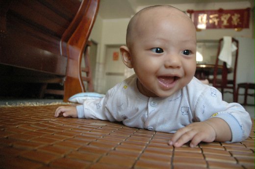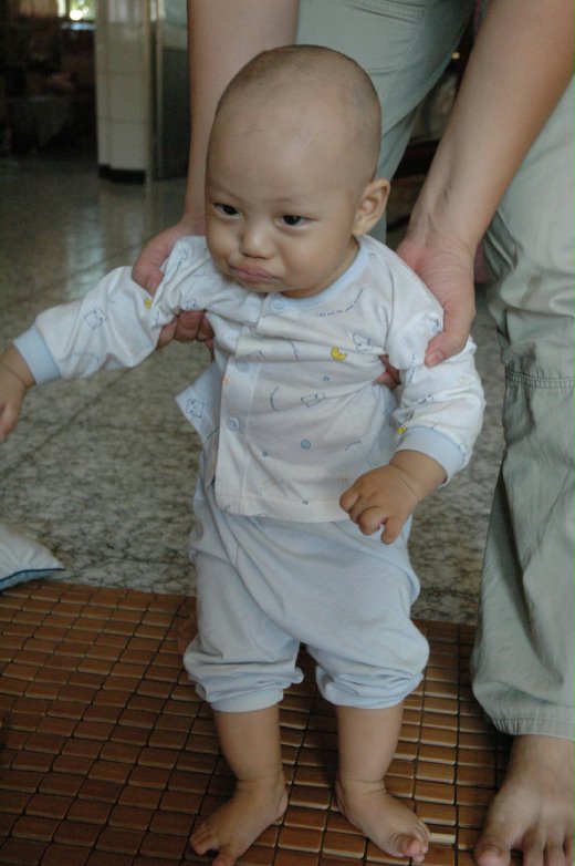 小豬對光頭造型很不滿,理完頭後逗他玩,他還是癟嘴,表達抗議。但最委屈的是,喝奶喝到一半,他伸手抓抓自己的光頭,表情超無辜,也讓小豬爸小豬媽感覺很對不起他。還好不久他就習慣新造型,笑得很燦爛。而過了一個月,頭髮已重新長出,光頭小豬又恢復成帥小豬了。