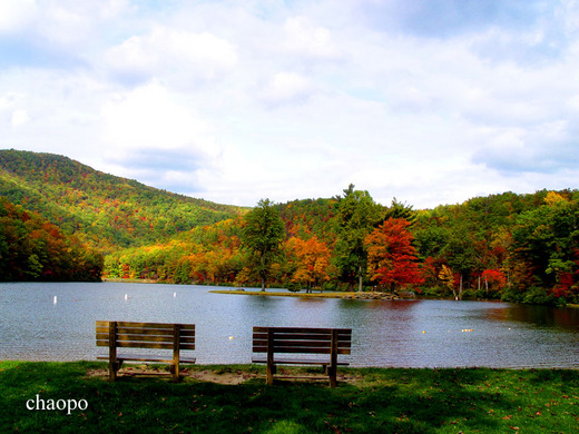 中午在幽靜小巧的Sherando Lake午餐小憩,湖中小島上矗著兩顆黃澄與豔紅的楓樹,四周群山倒映在湖面,傳達靜謐的美感。從來不知道這麼小的湖竟然可以美成這樣,靜成這樣。大家三三兩兩交換著自製的美食,我卻獨坐湖邊貪看著平生未見的天然美景。據說我們算是非常幸運的。因為即使來美多年也未曾像今年一樣這麼巧又這麼美,「因為來的太早葉子還未變色,來的太晚葉已落盡,今年是最好的時間。」Ken這樣告訴著我。