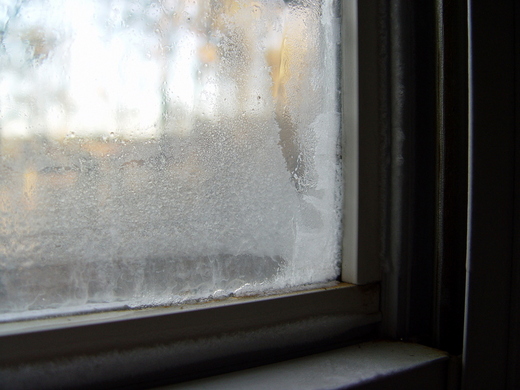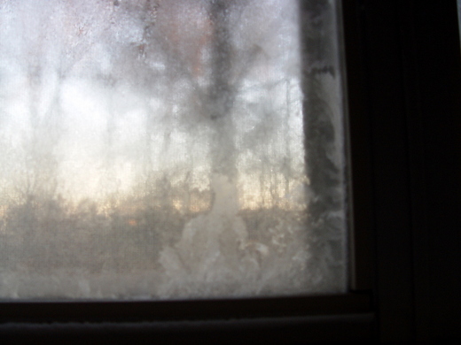果不其然,第二天一早醒來就發覺窗戶變得怪怪的,明明沒有下雨,卻變得髒髒的,看不清外面的景象。戴上眼鏡一看,嚇!原來是我們晚上睡覺呼出的熱氣已經在窗戶上結了一層冰,而且從外面結到了室內。