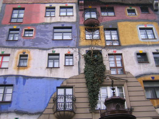 維也納百水公寓的外觀看起來像彩色積木玩具,位在多瑙運河邊,被當地人暱稱為「保齡球木瓶房子」,由市政府委託藝術家百水先生(Friedensreich Hundertwasser,1928-2000)設計興建的國宅。它以不規則的線條區分,卻又奇異地整齊排列,而每一層樓都漆上不同的顏色,還有不規則大小的窗戶。迴響(1) :