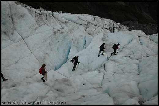 領隊不時用冰斧敲碎冰層,確保階梯寬厚好走,但那冰斧卻似敲在我心上,好心疼那整塊堅硬的冰層,竟因要讓我們這些侵略者好走,而被敲碎。我相信除了陽光的灼害,地球的暖化之外,觀光的傷害應是更嚴重的吧!這些年冰河融蝕的速度加快,人類似乎無法制止、改善,但是政府似乎應該關注此事,愛護大自然的遺產,否則後代子孫,再也無法看到這壯偉的奇觀了!