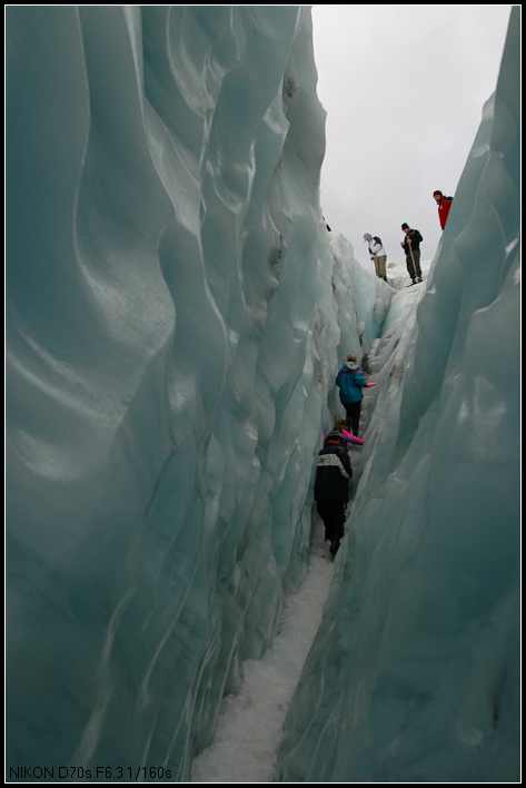 翻越過架設的梯子,終於看到了冰河。我們坐下來綁上鋼釘,即將要踏上冰河了,我好興奮!剛才辛苦的攀山越嶺,似乎都值得的。隨著領隊踏上晶瑩剔透的人工階梯,心中充滿了感動,這積累了萬年的冰河,靜靜地躺在這,灰白的冰層,自遠山迤邐而來,表層堅硬如石,有黑色的線條不規則的覆蓋,並不是印象中的雪白,看來表層的冰塊,承受了多少風雨砂石的摧殘!兩旁深褐色的山峰,冷默高聳,似乎是冰河的守護神,千萬年來他們竟這樣相依相偎了幾個世紀,我震懾於壯麗的冰河,也臣服於這樣的不離不棄!我們小心翼翼地走在冰河上,穿越只容側身的冰洞,嚴格的說是冰縫,窄得只容一人側身而過,摸著藍得透明的冰層,興奮自己與萬年前的水滴相遇。這段路最有趣、最美,我們似走進水晶宮裡,藍色透明的冰牆,望不到盡頭,夾在兩面晶瑩剔透的冰世界中,我好感動!這段冰縫只是這條長長冰河的萬千分之一,我們踏不到冰河的底層,不知它尚有多深?也不知它在怎樣的時空下凝結?我們只是有幸在二十一世紀拜訪了它,深入在它的懷抱中。好想多聽聽萬年前的故事,多撫摸萬年前的水滴,可惜後面的人急著進來,我只能匆匆告別,心中暗自擔憂那滴落的水滴,會否再凝結回去?