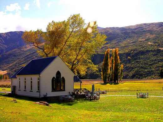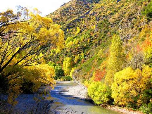 這幾年紐西蘭的造酒業蓬勃滋長,在奧塔哥中部山區,沿著溪谷兩岸,全是酒莊。據說法國的造酒專家,發現這裡的氣候溫度類似地中海形氣候。所以一進入山谷,滿眼望見的是一大片一大片的葡萄園,園中一列列整齊的直立樁柱,爬滿了葡萄藤,結實纍纍的藤架,為了免於被鳥啄食,覆蓋了一層白色紗網,在陽光下炫耀他的豐收。已經採收完成的藤架,撤去了紗網,泛黃暗紅的葉片,在風中招展,為山區增添了富麗的色彩,在連綿的山谷中, 形成一幅特殊的「秋山紅葉圖」。