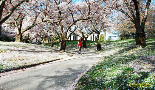 海格麗公園有一條櫻花道,當花開時,我特別愛散步其下,看著兩旁滿樹的花,枝枒在中間交織成花棚,當微風拂過,細嫩的粉色花瓣紛紛飄落,輕柔柔的花雨,好典雅!有時佇立樹下,似有若無的花香,隨著青草味,淡淡襲來,一任花瓣飄落身上,不忍拂去!有時伸手去接,但總也接不住,而花影在風中優雅地飄落,鋪了ㄧ地,像粉色地毯,讓人不忍心踩踏,「古人有踏花歸去馬蹄香」的詩句,而我終於享受到「踏花歸去鞋底香」的浪漫了。